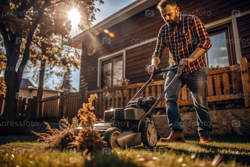 Человек в квадратной рубашке с газонокосилкой стрижет траву на заднем дворе. сельскохозяйственное оборудование для содержания сада. концепция садоводства и деревенской жизни
