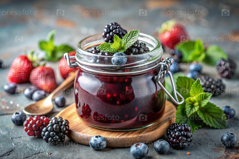 Банка домашней черники, здоровый варенье с мятой на чёрном фоне.Сохранение и уборка летом
