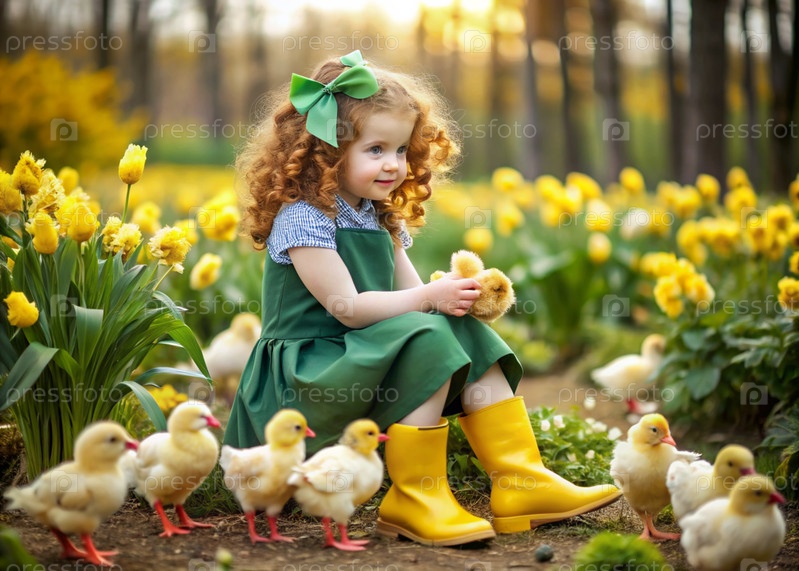 Маленькая кудрявая девочка в резиновых сапогах в цветущем весеннем саду с желтыми цыплятами