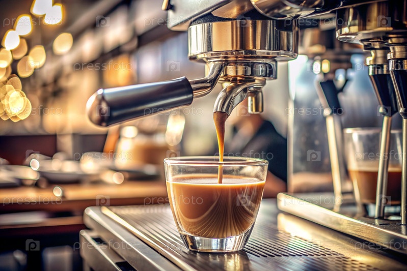 Свежеваренный кофе, заливаемый из кофейной машины на размытом фоне кафе или ресторана