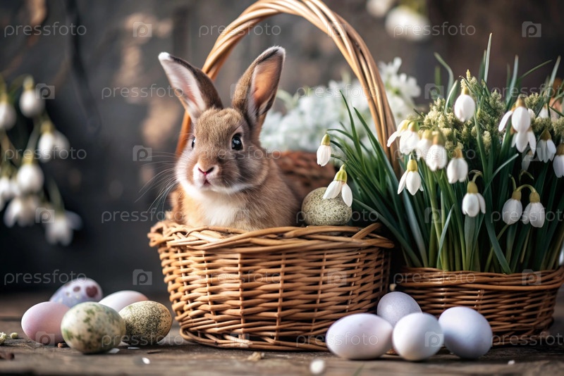 Баннер. пасхальный кролик в корзине из красочных пасхальных яиц вокруг весенних снегопадов и первичной розы. концепция праздника Пасхи