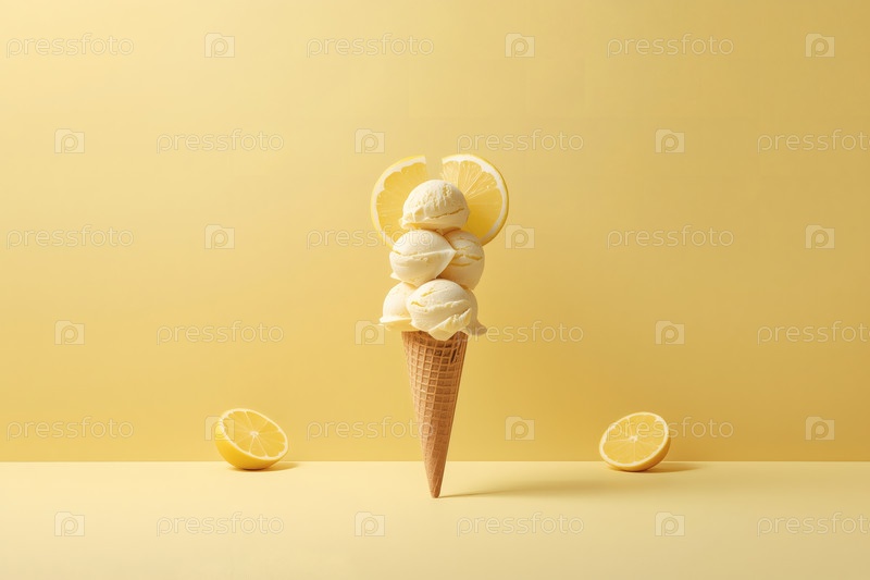 Лимонный мороженый конус на желтом фоне. Минимализм. Кремное ванильное мороженое. Баннер, реклама. Всемирный день мороженого