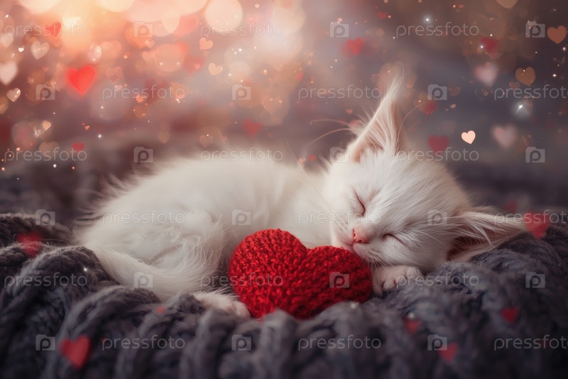 Концепция Дня святого Валентина. красное вязаное сердце и белое котенок. открытка с кошкой на вязанном одеяле