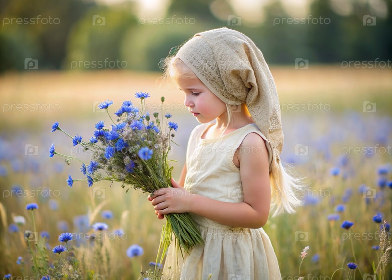 Портрет красивой девушки в белом платье с букетом синих цветов кукурузы.Ребенок позирует и смотрит на букет