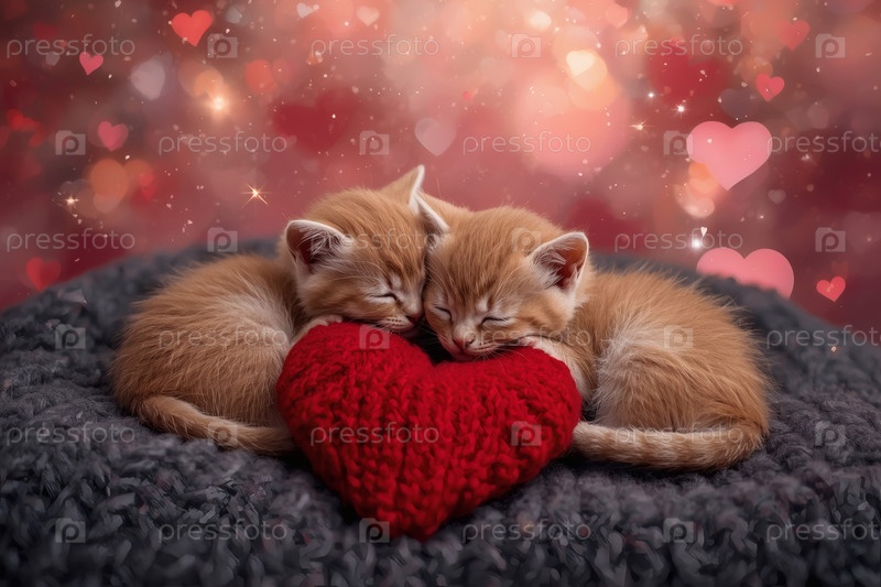 Концепция Дня святого Валентина. красное вязаное сердце и два спящих котенка. открытка с котятами на вязанном одеяле