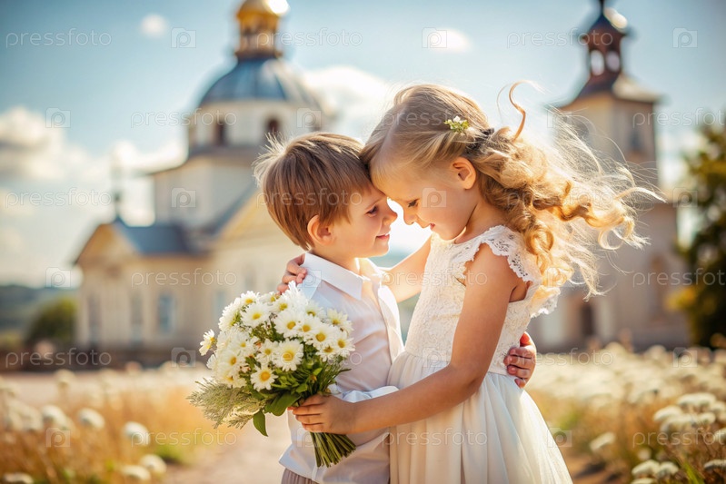 Всероссийский день семьи, любви, верности. милый маленький кудрявый мальчик и девочка с букетом ромашек на фоне православной церкви. День святого Валентина Петра и Февронии