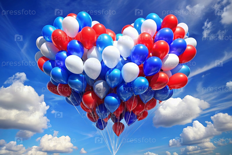 Концепция празднования Дня России 12 июня.Сердечно-образные воздушные шары в цветах триколора России.Белые, синие и красные шарики летают по голубому небу