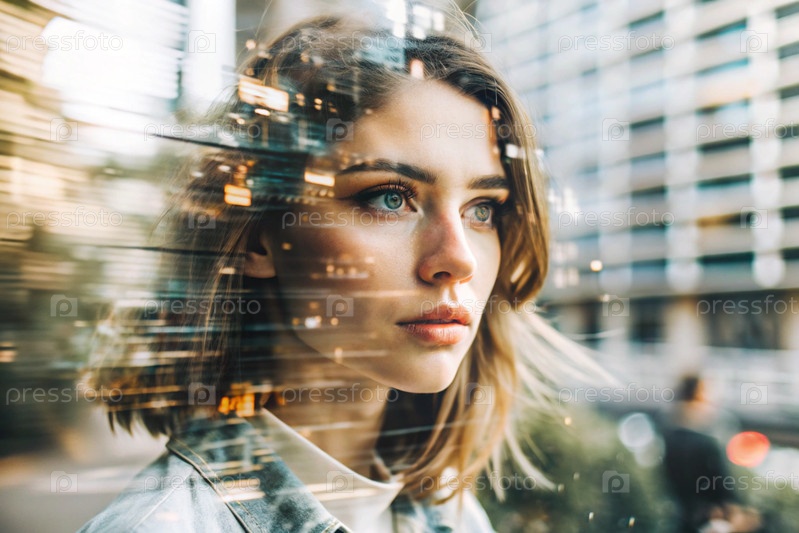 Портрет молодой женщины.Концептуальное искусство Клубовое изображение на фоне города с двойной экспозицией и визуальными эффектами