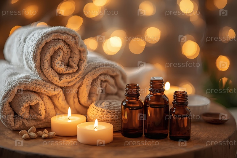 Ароматерапия. Стеклянные бутылки для масла, лосьона, свечей и свежих полотенцев на деревянном фоне. Естественная органическая экокосметика. Дизайн корпоративного стиля салона красоты