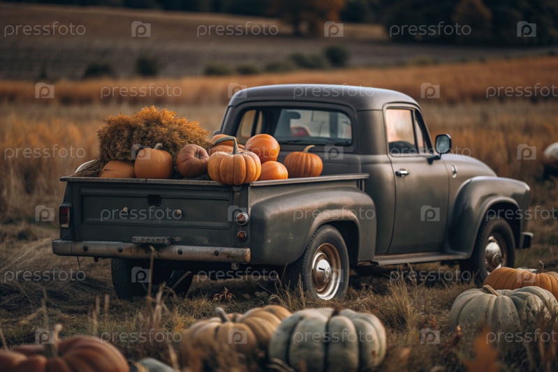 Осень, осенний дизайн.Большой урожай тыквы на заднем сиденье ретро-пикапа, крупный план