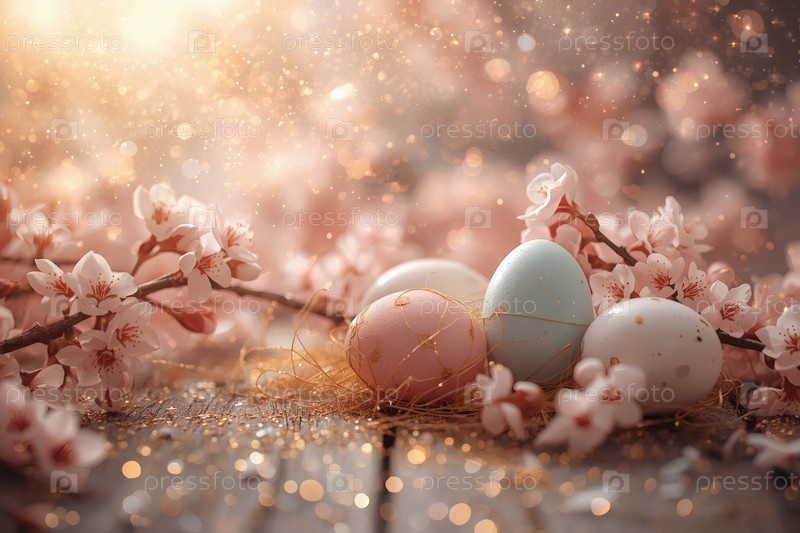Концепция яркого пасхального праздника в 2026 году.Концепция ярких пасхальных праздников.Нежные розовые пасхальные яйца и вишневые ветви на деревянном фоне