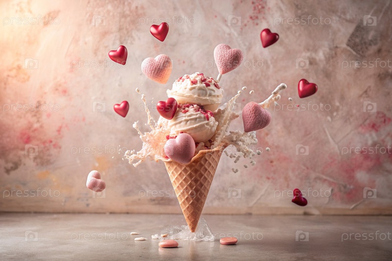 Сладкий десерт. Любовь к мороженому. Сердечно-образный конус мороженого с брызгами, сердцами и пятнами. Концепция Дня святого Валентина. Баннер, реклама