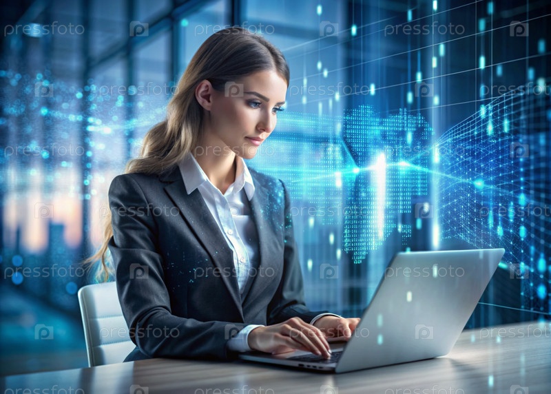 Красивая молодая женщина в костюме работает на ноутбуке в офисе с цифровыми кодами на виртуальном экране Цифровые технологии будущего Разработка программного обеспечения