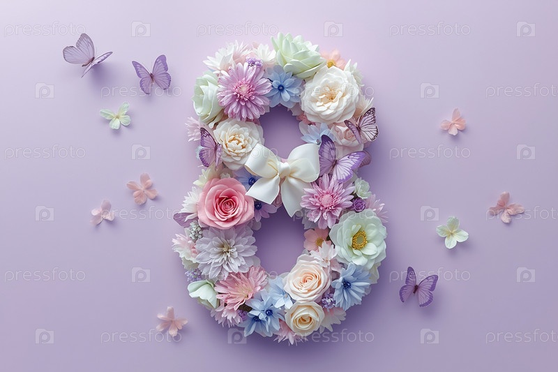 Международный женский день. баннер, флаер, красивая открытка на 8 марта. цветы в форме цифры восемь и бабочки на лиловом фоне