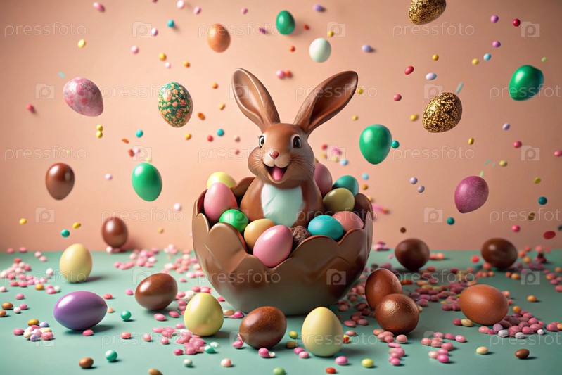 Известный праздник. милый пасхальный кролик заглядывает из ямы с красочными яйцами вокруг. концепция счастливой Пасхи