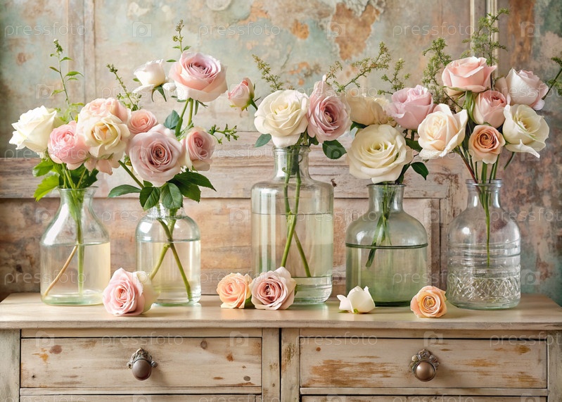 Красивые розы в стеклянных вазах и флаконах на древнем деревянном шкафчике Букет цветов в вазе в интерьере дома Светлый, бежевый, розовый цветочный фон