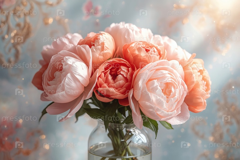 Букет мягких розовых коралловых пион в стеклянной вазе на синем фоне. Цветы и почки в вазе. светло-розовый, цветочный фон