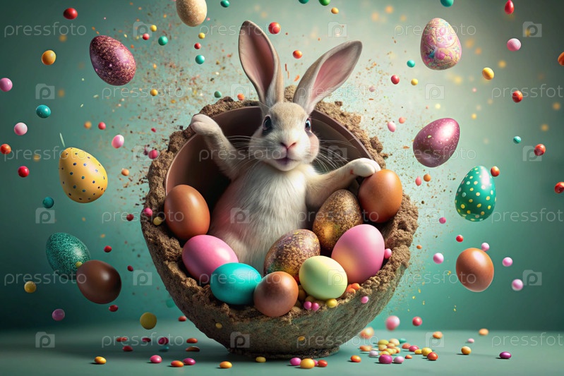 Известный праздник. милый пасхальный кролик заглядывает из ямы с красочными яйцами вокруг. концепция счастливой Пасхи