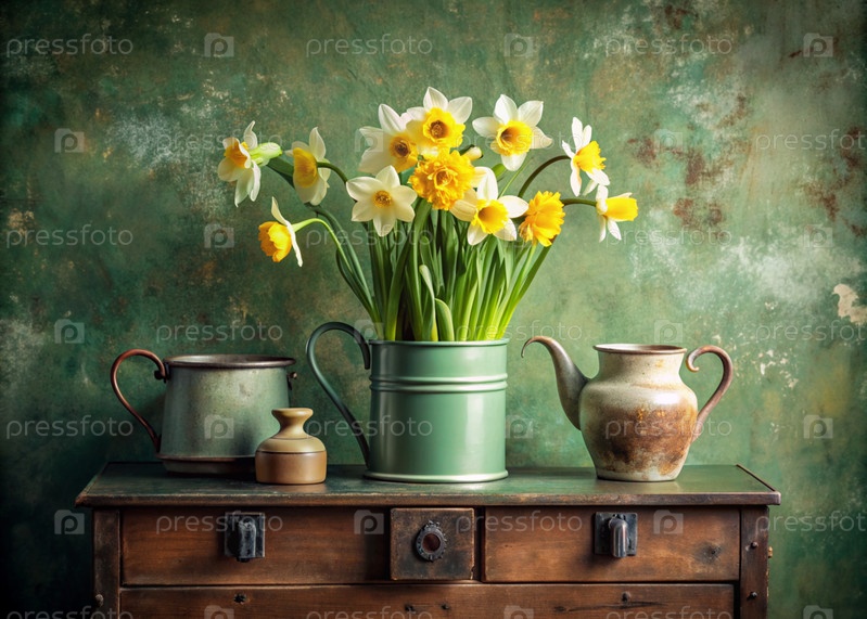 Красивые весенние нарциссы в железной винтажной вазе и горшки на старом деревянном шкафу. Букет цветов в вазе в интерьере дома. Желтый, зеленый, бежевый цветный фон
