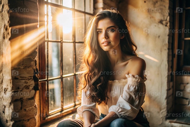 Портрет красивой девушки с кудрявыми волосами у окна старого дома, в котором светит теплое яркое солнце. Романтическое изображение. Одиночество, пустота и ожидание