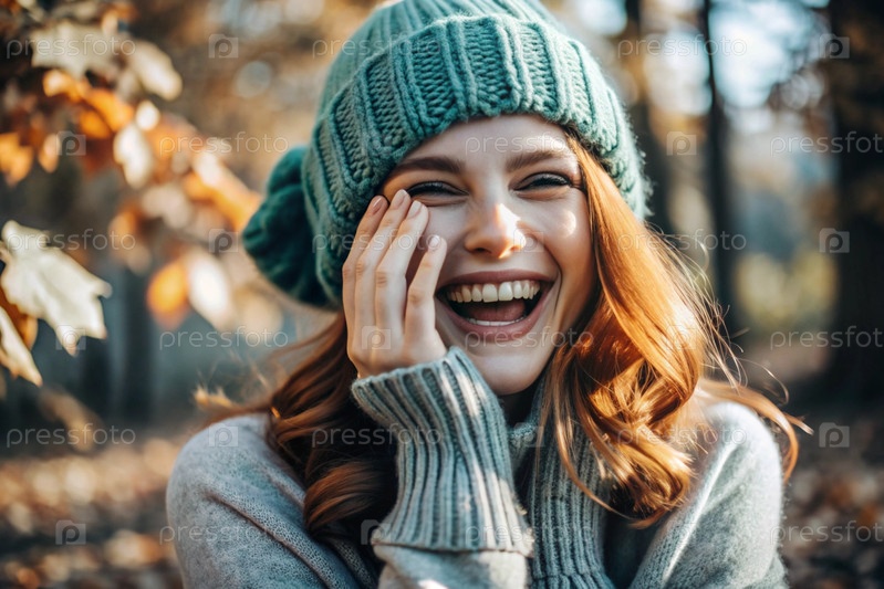 Осенний портрет. Близкий план молодой рыжеволосой женщины с ярко выраженными зелеными глазами в вязанной шляпе и свитере. Девушка смеется под лучами закатывающегося осеннего солнца