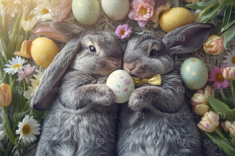 Пасхальные кролики лежат на пасхальных яйцах и смотрят в камеру