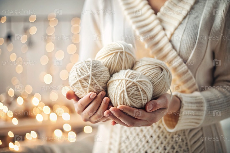 Близко. женщина с шариками пряжи в белых и бежевых тонах в руках. Игла, вязание. Зимний сезон, малый бизнес, ручная одежда