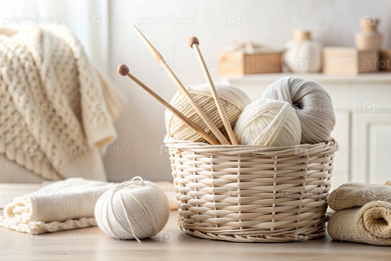 шарики пряжи в корзине из плесеня в белых и бежевых тонах швейная работа, текстиль, вязание зимний сезон, малый бизнес, ручная одежда