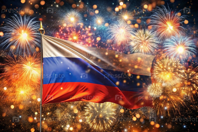 Россия. Москва. Национальный флаг Российской Федерации на фоне фейерверков. Русский триколор. День России отмечается 12 июня