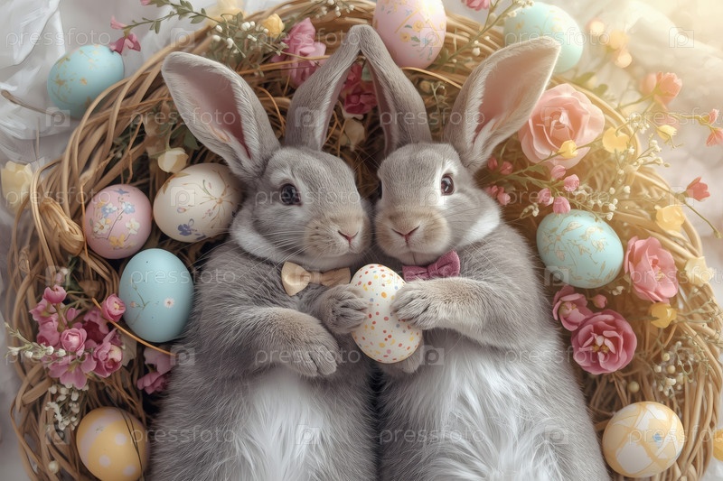 Пасхальные кролики лежат на пасхальных яйцах и смотрят в камеру. праздничная открытка или баннер. счастливая Пасхальная концепция в 2026 году