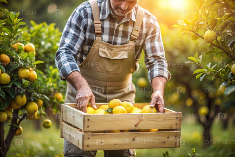 Сельскохозяйственная промышленность. Деревянный ящик с лимонами в руках фермера. Садовник собирает богатый урожай. Ближе, солнечный свет. Осенний плодовый сбор