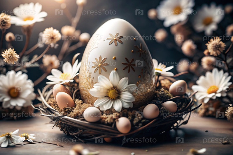 Пасхальный баннер. Концепция яркого пасхального праздника. Необычное деликатное пасхальное яйцо с нежными белыми цветами