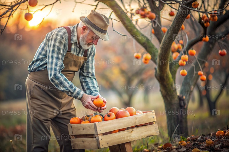 Сельскохозяйственная промышленность. Деревянный ящик с персимом в руках фермера-мужчины. Садовник собирает богатый урожай. Ближе, солнечный свет. Осенний плодовый сбор