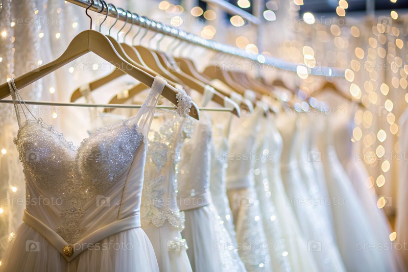 Аренда и покупка свадебных платьев для мероприятий. Близкие. Свадебные белые платья висят с белых вешалок на стойке в свадебном салоне магазина