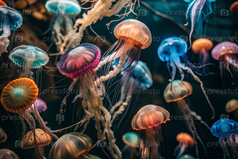 Скуба дайвинг. Дайвинг. Красочные медузы плавают в тропических водах. Медузы в подводном мире диких животных. Наблюдение за океанической фауной