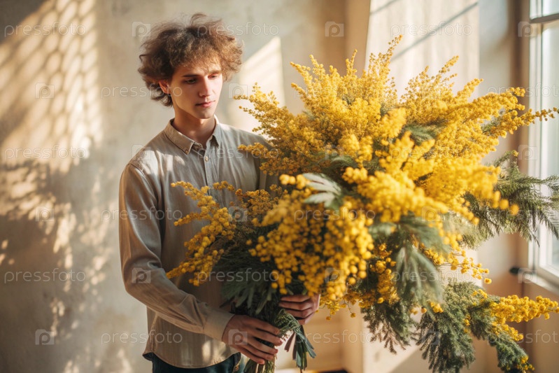 Мужчина с великолепным букетом мимозы.Мужчины дарят цветы девочкам.Ближе.Концепция весны и Международный женский день 8 марта