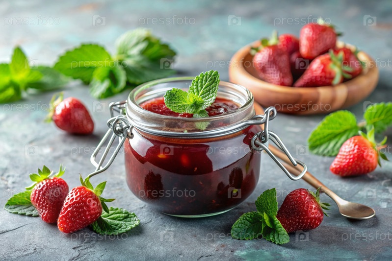 Банка домашней клубники, здоровый варенье с мятой на черном фоне.Сохранение и уборка летом