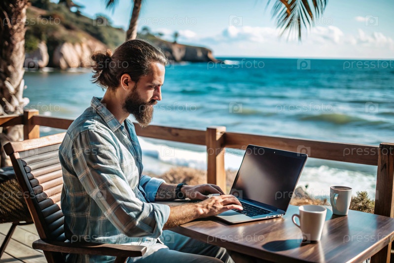 Молодой бизнесмен-фрилансер работает на ноутбуке, отдыхая у моря или делая покупки в Интернете