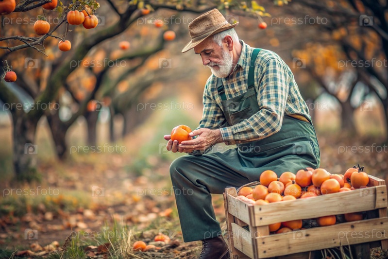 Сельскохозяйственная промышленность. Деревянный ящик с персимом в руках фермера-мужчины. Садовник собирает богатый урожай. Ближе, солнечный свет. Осенний плодовый сбор
