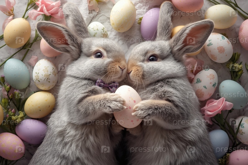 Пасхальные кролики лежат на пасхальных яйцах и смотрят в камеру. праздничная открытка или баннер. счастливая Пасхальная концепция в 2026 году