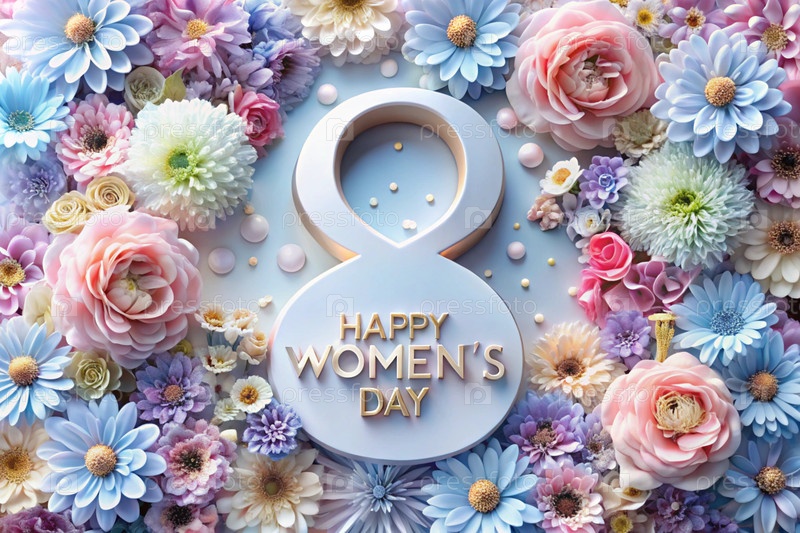Международный женский день. Баннер, флаер. Праздничный, нежный цветочный фон в голубых и розовых тонах с номером 8