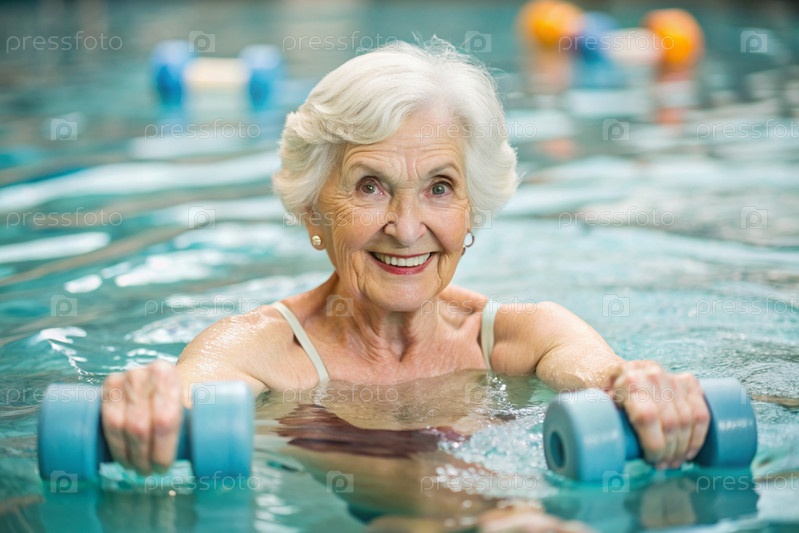 Пожилая женщина плавает и занимается водной аэробикой в отопительном бассейне, счастливый и улыбающийся пенсионер