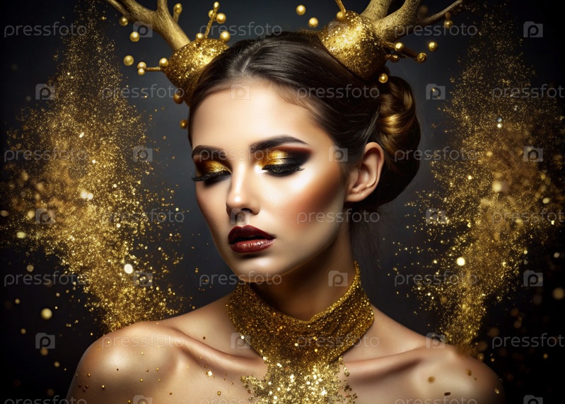 Творческий баннер для салона красоты в черно-золотых тонах. Профессиональный макияжный художник, стилист и парикмахер. Красивая женщина с вечерним гримом и золотыми рогами на голове. Индустрия красоты
