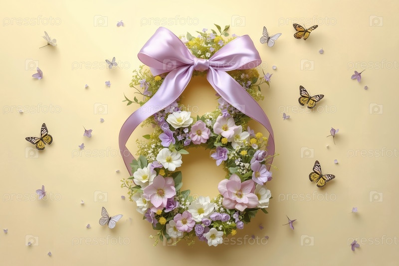 Международный женский день. баннер, флаер, красивая открытка на 8 марта. цветы в форме цифры восемь и бабочки на желтом фоне