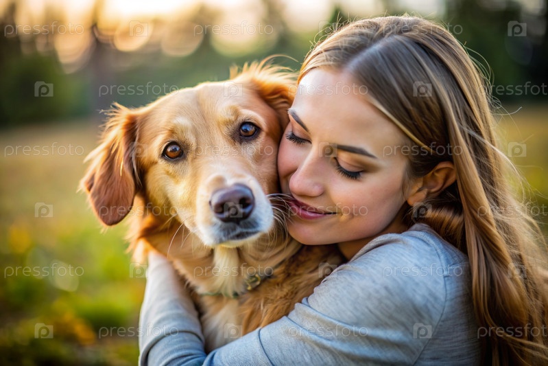 Животные.Молодая женщина обнимает собаку.Сознательная жизнь с питомцем, понятие дружбы и любви к животным