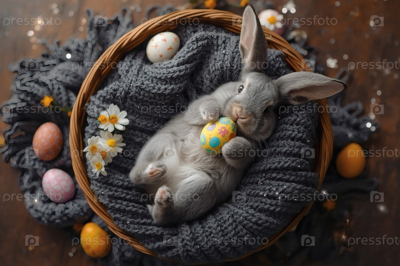 Пасхальный кролик держит пасхальное яйцо в лапах, лежит на спине на сером вязанном одеяле и смотрит в камеру