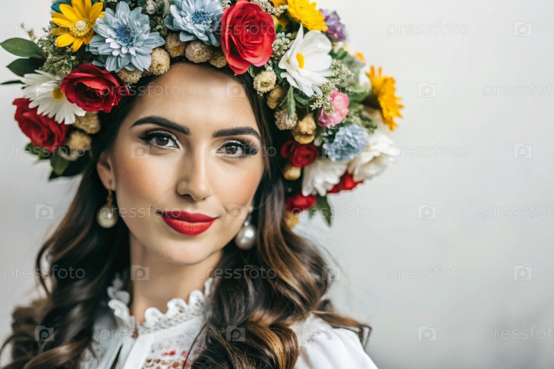 Портрет красивой молодой женщины в ближайшем плане с цветочной тиарой или венком на голове на белом фоне