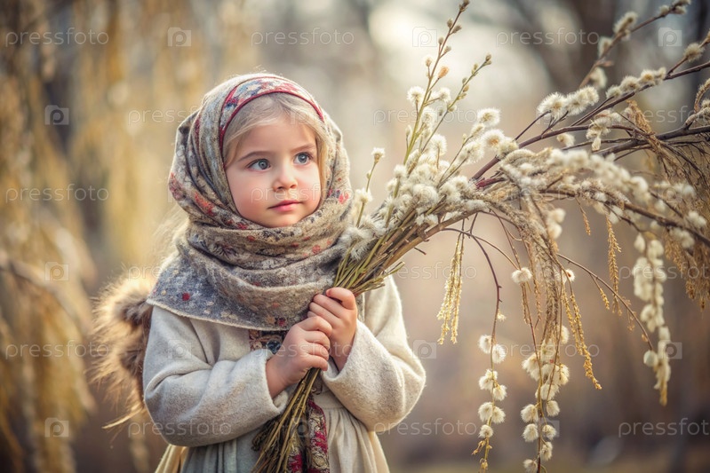 Пальмовое воскресенье. христианство. портрет трехлетней девочки в русском народном шале с ветвями ивы в руках на фоне цветущей ивы