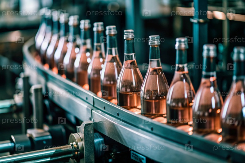 Пищевая промышленность. Конвейерная лента. Линия розного вина в стеклянных бутылках на фабрике. Близкий план бутылки розового игристого вина