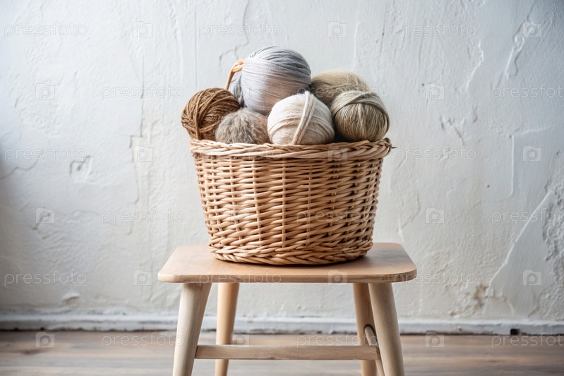 шарики пряжи в корзине из плесеня в белых и бежевых тонах швейная работа, текстиль, вязание зимний сезон, малый бизнес, ручная одежда